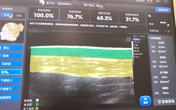 今年特别热门、特别流行、特别可视化的一款院线专用款皮肤检测仪(检测系统),那就是Ai超声皮肤检测,随着Ai技术的加速普及,Ai技术已经渗入到医学美容行业。传统的皮肤检测仪是光学成相采集+算法,新的Ai超声皮肤检测采用的是高频超声实时采集+算法。它采用的多普勒技术是无损的,它不会伤害皮肤,配合耗材由金兴森公司“藕来宝OURABO”生产的专用Ai超声耦合贴片/垫,使得图像实时采集清晰,从皮肤表皮到肌肉、筋膜层,层层一目了然。技术的更新迭代,科技的发展。面部年轻化更是众多爱美人士的追求。从热玛吉、超声刀、激光美容、超声炮、光疗、小气泡、小分子等等到现在的科技前沿使用Ai技术的皮肤超声检测仪。使得面部的医学美容,能从容定向使用;因人而异,让医美专家对患者的面部给药更加科学、更佳精准。